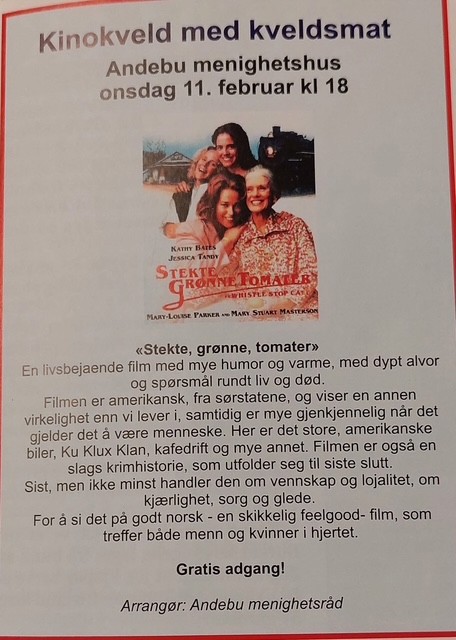 Onsdag 11. februar kl. 18.00 er det kinokveld med kveldsmat i Andebu menighetshus. Der viser vi filmen " stekte, grønne, tomater".